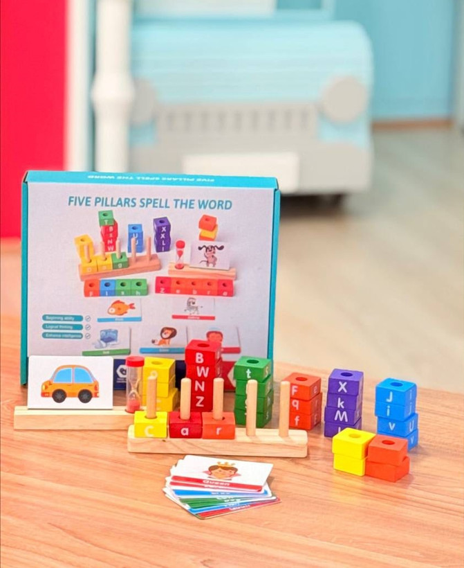 کودک با استفاده از ستونهای چوبی، حروف رنگی را روی پایهها قرار میدهد و مطابق کارتهای تصویری، کلمات ساده انگلیسی را میسازد.
